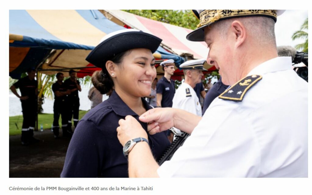 Presque 300 ans plus tard, c’est dans cette commune que les stagiaires de la préparation militaire Marine (PMM) Bougainville ont reçu leurs insignes, en présence de leurs familles et de nombreux marins, dont l’équipage A du BSAOM Bougainville, mais aussi de la classe de défense du collège d’Hitia’a.