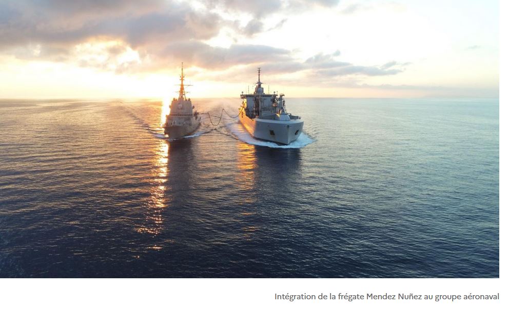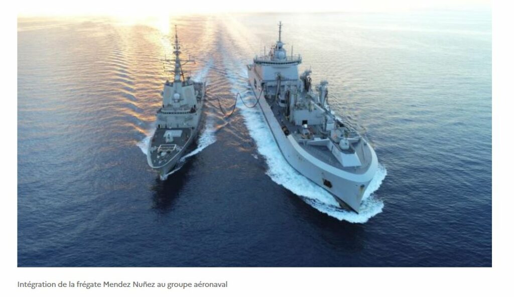 Le bâtiment ravitailleur de forces (BRF) Jacques Chevallier a mené avec succès un ravitaillement à la mer (RAM) au profit de la frégate espagnole Mendez Nuñez. Ce ravitaillement marque ainsi le début de l’intégration de la frégate espagnole au sein du groupe aéronaval et de la Task force 473.