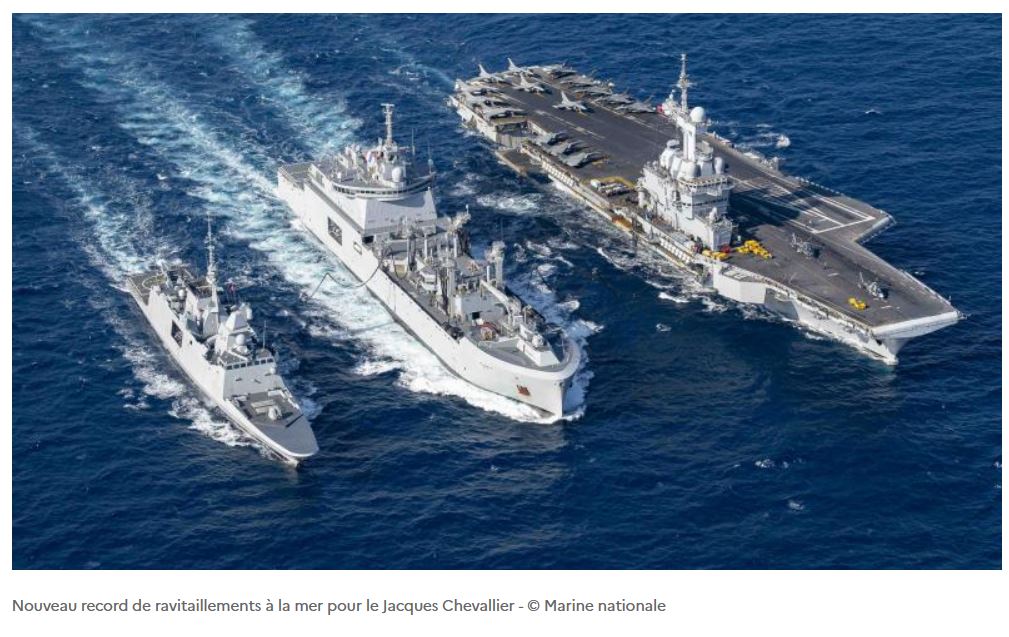 Le 12 mars 2026, le bâtiment ravitailleur de forces (BRF) Jacques Chevallier, déployé en Méditerranée orientale au sein du groupe aéronaval (GAN), a réalisé neuf ravitaillements à la mer (RAM) en une seule journée. Il dépasse ainsi son précédent record de sept ravitaillements à la mer établi lors du dernier déploiement du groupe aéronaval.